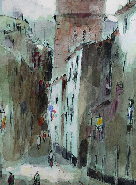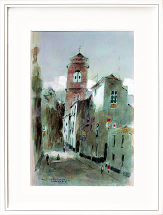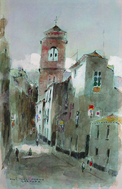 スペインのグラナダの教会風景です。この近くに住んでいたので見慣れた景色でしたし、何度かスケッチもしているので、絵の狙いもはっきりしてすっきりと描けました。やはりはじめて描く作品よりスケッチをした方が構図などが頭の中で整理できて上手くいきます。作品は教会を引き立たせる為に少し暗めの色調でモノトーンにまとめています。落ち着いてみれる作品になっていると思います。